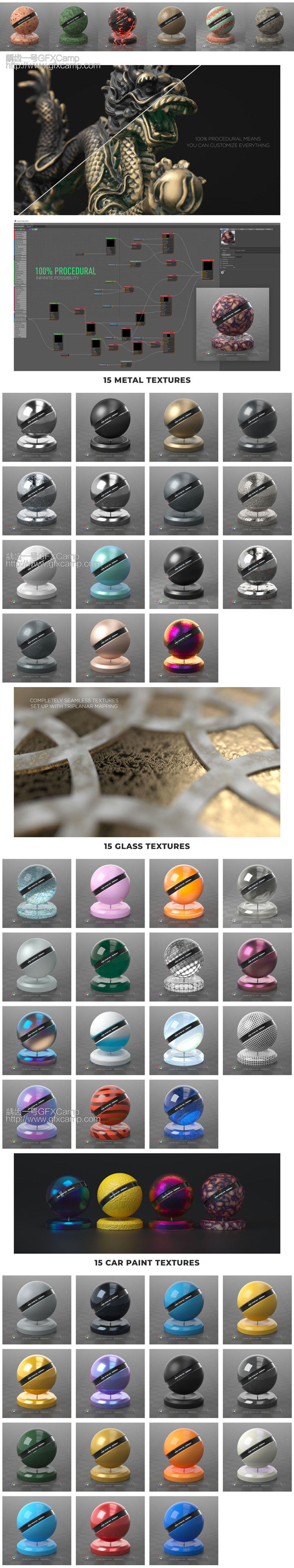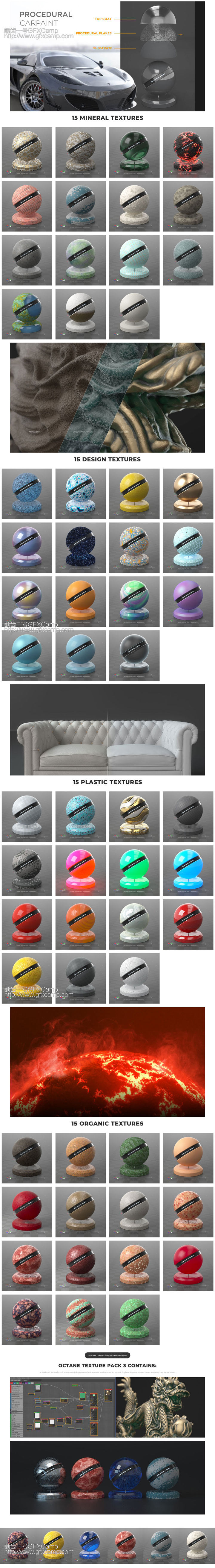 包含100个Octane渲染器用的C4D材质预设,无缝衔接的,包含钢铁、玻璃、车漆、矿物、有机物、塑料、设计感等多方面效果材质,所有的材质细节程度都可以调节调节的