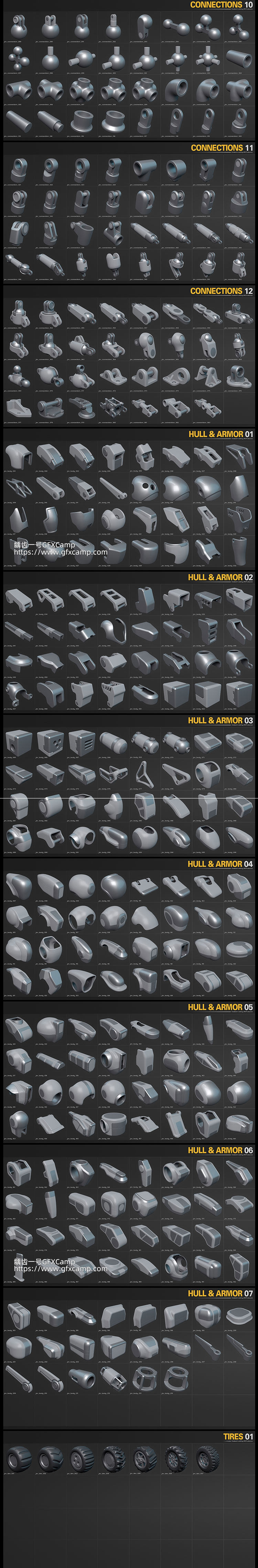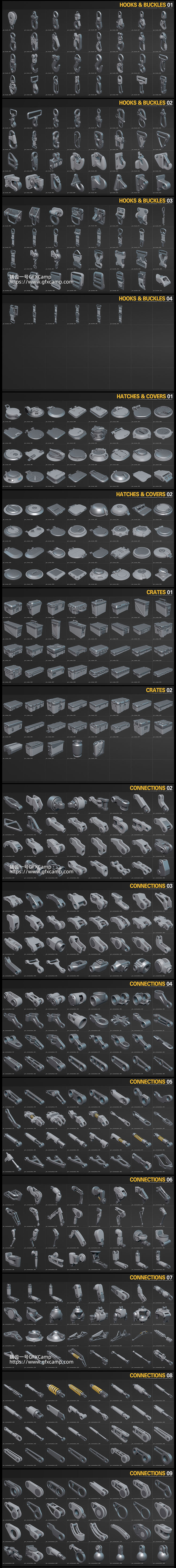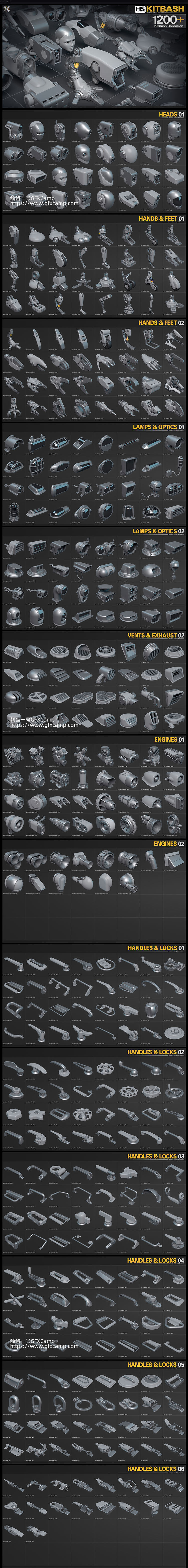 包含1271组科幻硬表面风格零部件3D模型,比如手脚、头部、零部件、连接、灯、通风管、引擎、锁、手柄、钩、盖子、盒子、护甲等多种分类,FBX/OBJ/Maya格式,每个直接的分类在一起的工程,也包含每个模型单独分类的模型,包含预览图,方便查找使用,每个模型都已经细分和展UV