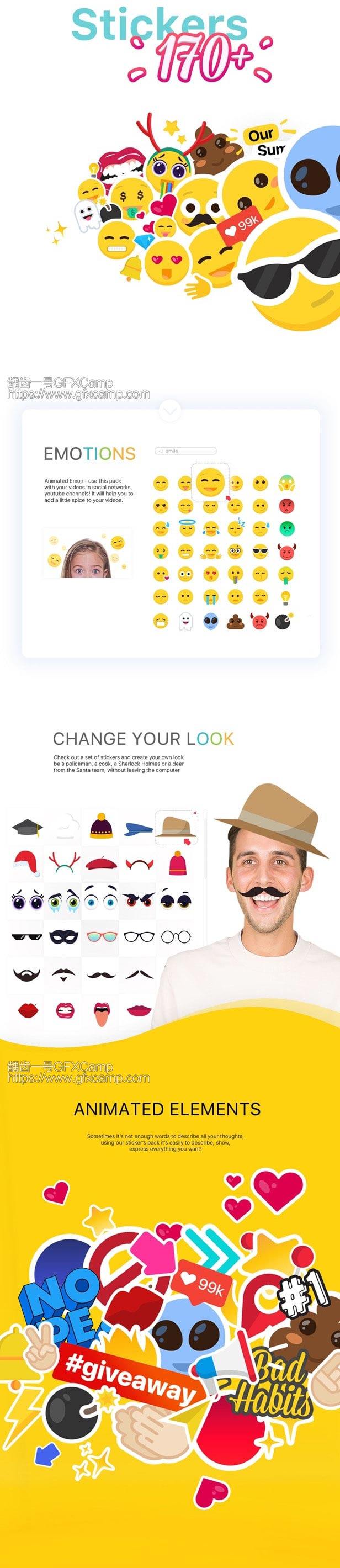 一共196个表情装饰元素,所有元素都支持AE和PR,大小旋转等基本参数都可以直接修改,包含GIF动图预览,方便查找使用: