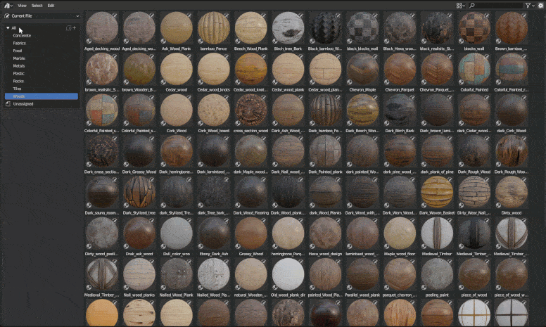 - 包含5000+ PBR材质贴图资产预设,比如木纹、石头、钢铁、砖墙、食物、路面、大理石、布料织物、塑料、条纹图案、其他等,安装后在资产浏览器里预览调用,十分方便
