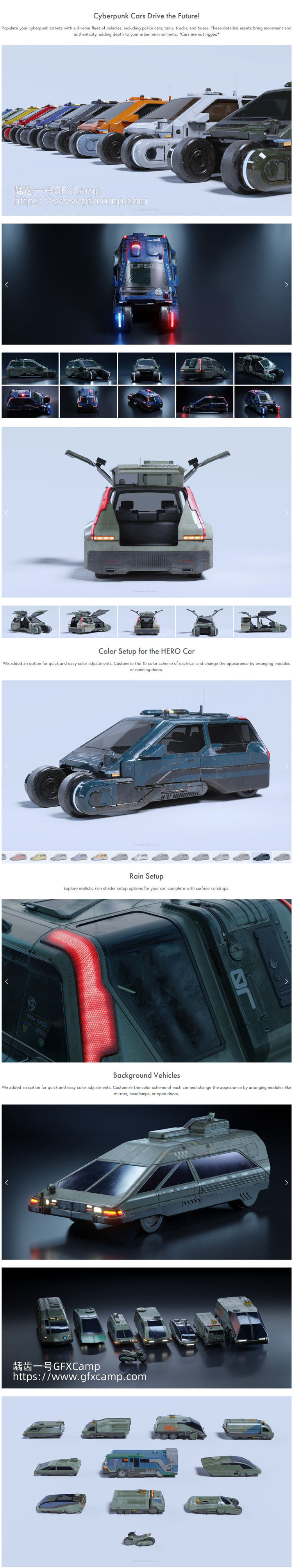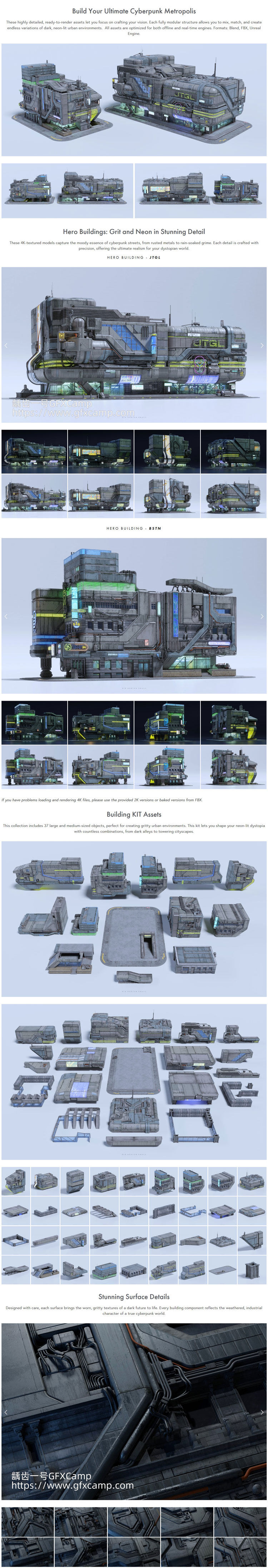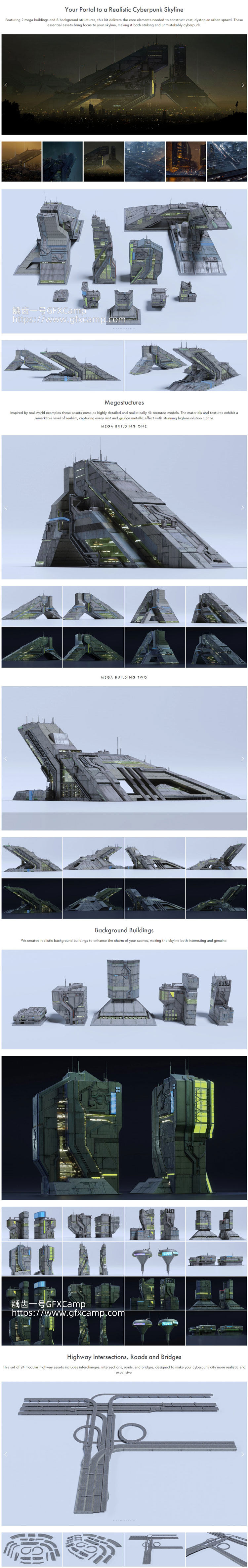 - 该素材包含200多个模型:2座细节丰富的大型建筑、37 个楼房模块、2个建筑结构、8个背景建筑、24个高速公路模块化资产、1辆带有 15 种不同配色的汽车、1个高速公路交叉口组件、3个大型地面街道组件、24个街道道具、13个路灯、67个霓虹灯和图形标志、12 个背景车辆等