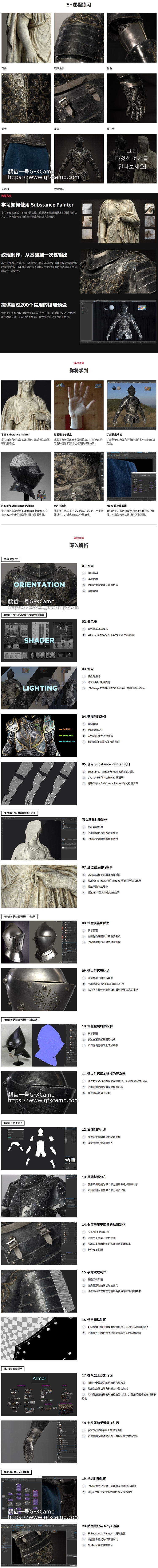 本教程将全面覆盖Substance Painter的使用方法,将从纹理理论学到UDIM控制,以及如何与Maya等外部工具集成,包括了解Substance Painter的使用基础、贴图理论与质量、Maya 和Substance Painter的结合、程序化贴图等,讲解石头、金属、皮革、天鹅绒、锁子甲、铠甲等多种真实材质的制作,超过20个示例材质与场景文件、160个笔刷资源