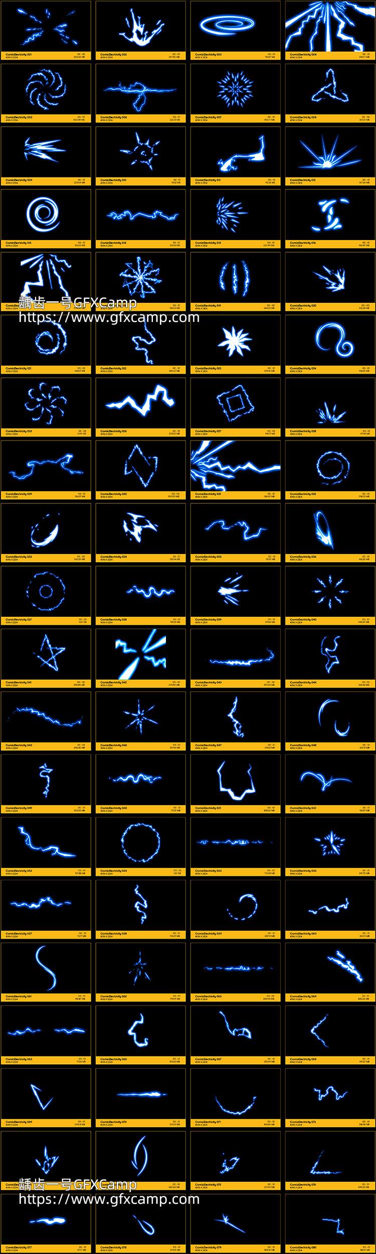 包含80组卡通风格电流能量特效视频素材,4K分辨率,MOV格式,Proress 4444编码,包含透明通道,任何后期软件都可以直接使用,也包含每个元素的AE和AI工程源文件