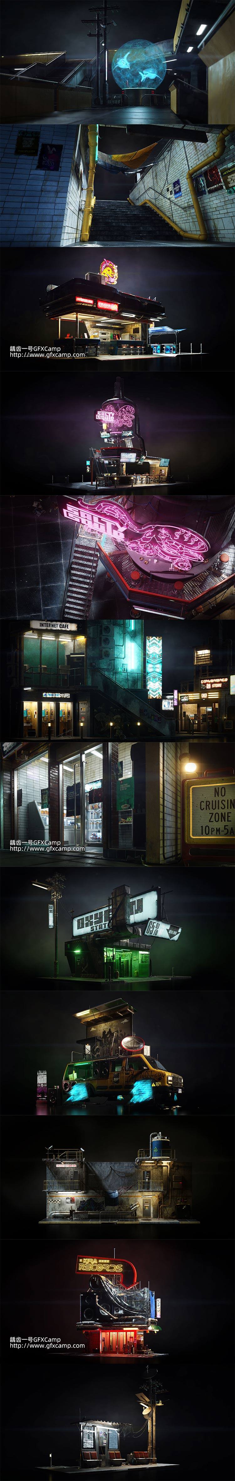 赛博朋克城市街道设施建筑3D模型 C4D/MAX/FBX/OBJ/Maya/Blender/Houdini/Unreal等