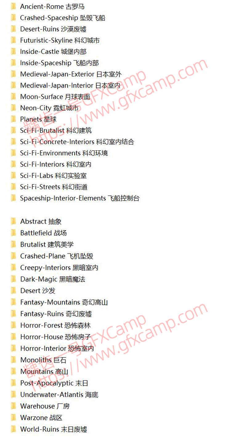 - 官方结合AI出的图,包含两套共1600张战争废墟、科幻、奇幻、恐怖、星球、中世纪、飞船、坠毁、建筑、室内外等背景环境图片素材,可以用于平面或者视频合成背景
