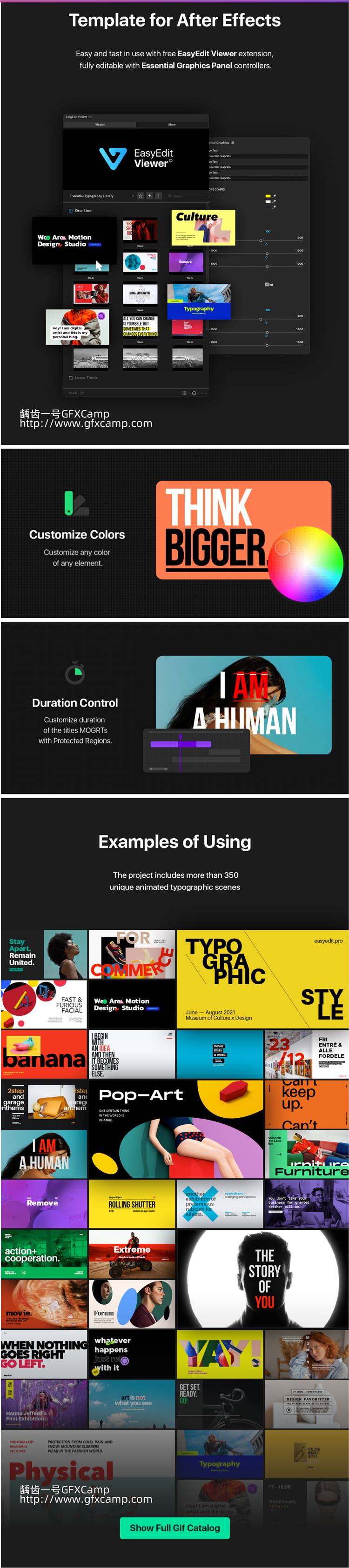 - 包含350组文字标题字幕排版动画,通过EasyEdit Pro脚本(已包含)来调用,可视化,需要哪个效果直接生成即可,十分简单,所有的文字,字体,颜色,大小等基本参数都可以修改