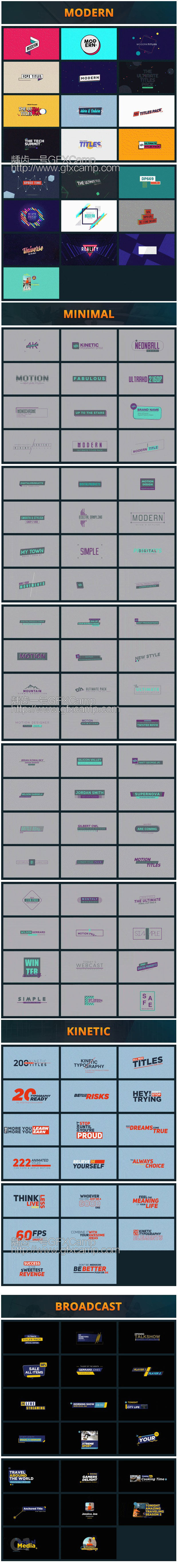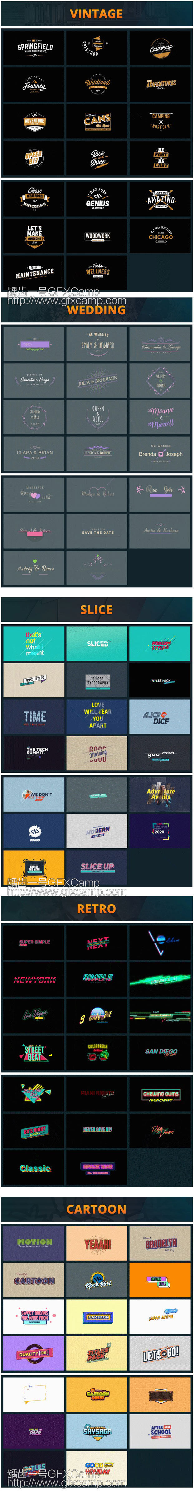 - 包含现代时尚、简洁标题、运动排版、栏目包装、复古、婚礼、切割、卡通等222个文字标题动画