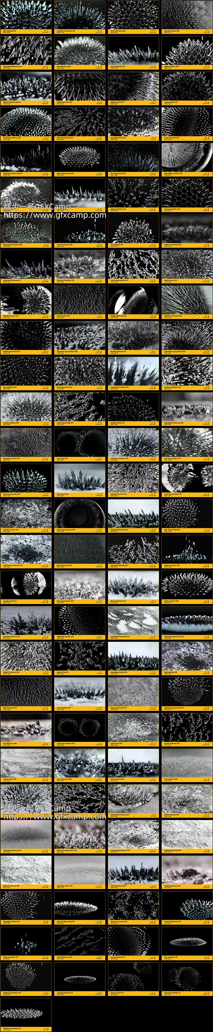 包含113组近距离观察磁铁吸附效果的视频素材,4K分辨率,MP4格式,H264编码,不包含透明通道,修改混合方式(屏幕/滤色)即可叠加到自己视频上