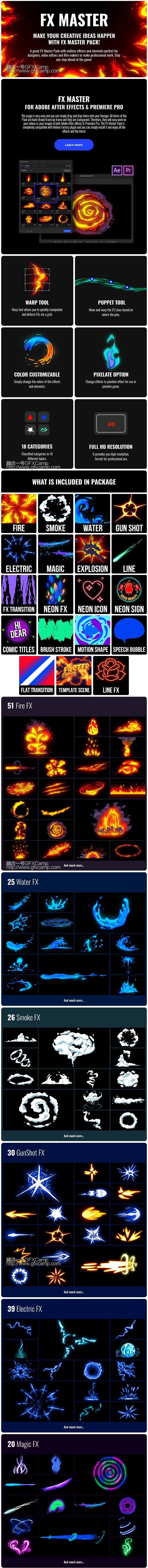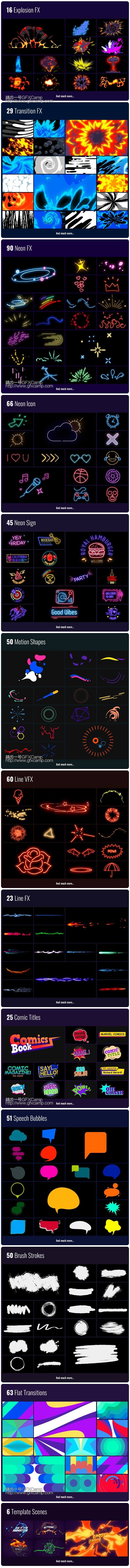 包含火焰、电流、爆炸、霓虹灯元素、水流、烟雾、对话框气泡、线条动画、文字标题等800+元素动画,通过Motion Factory脚本调用(已包含),可视化操作十分方便,需要AE或者Premiere CC 2019或者更高版本,低版本无法使用