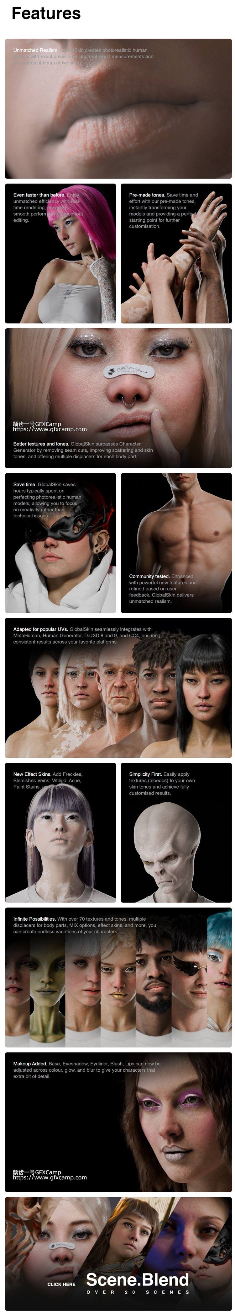 Blender一键生成真实人物皮肤着色器材质贴图预设插件 Globalskin – Ultimate Skin Shader+24个真实人物3D模型 Hyper Realistic Scenes