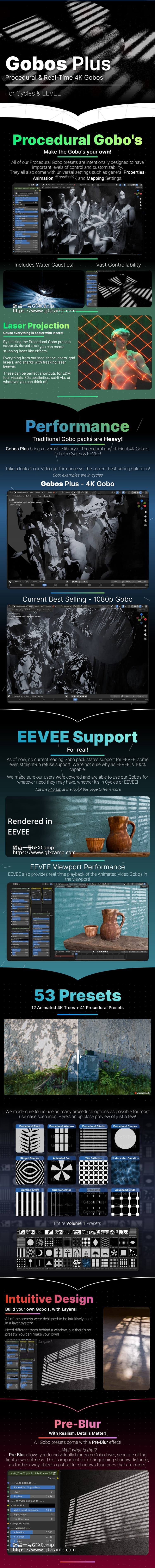- 包含53组动态光线投影贴图资产预设,比如窗户、树木、几何图形等,安装后在资产浏览器里调用,可视化,拖拽使用,控制模糊程度等多种参数可以调节,支持Cycles和EEVEE渲染器