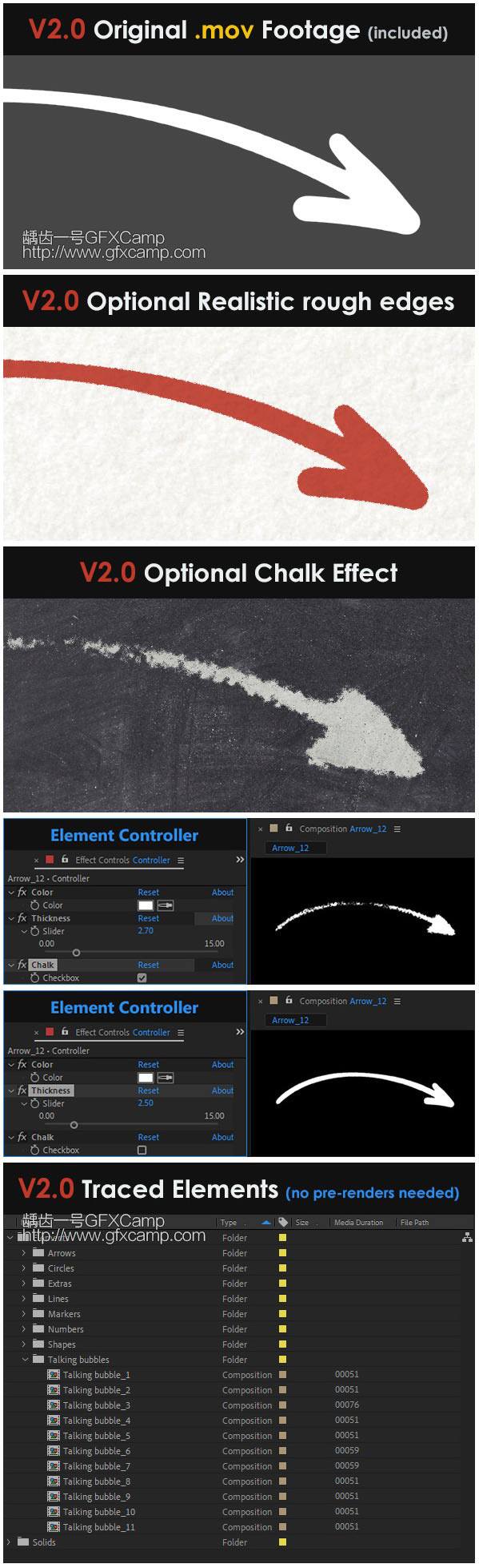 包含箭头、圆圈、数字、方框、气泡、加减乘除、√、X、线条等多种手绘风格元素动画,包含AE工程+渲染好的视频素材两种形式