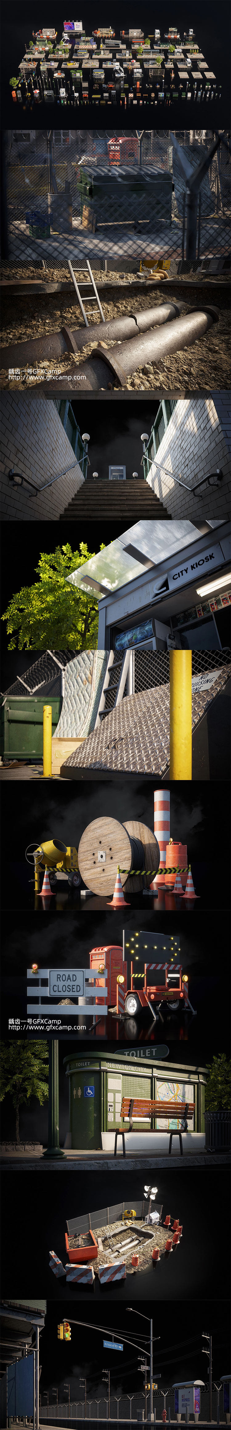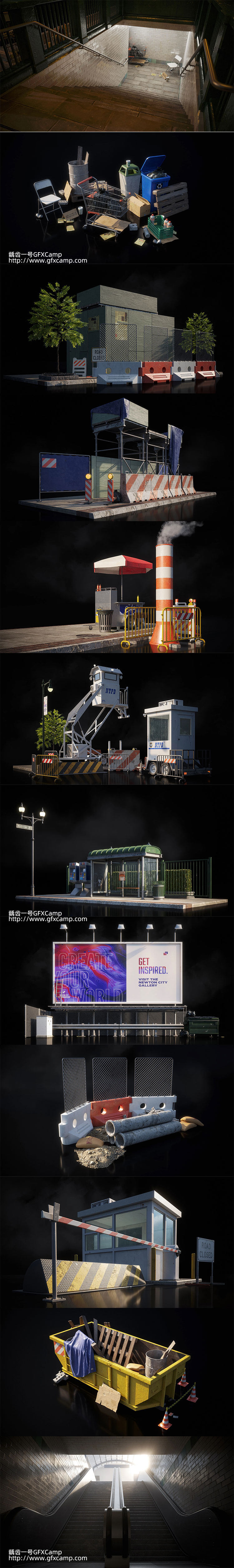 包含街道里一些公共设施的3D模型,比如红绿灯、售货亭和围栏,食品摊、购物车和垃圾桶、电话亭、候车亭等,这是单独的模型,不是直接做好的场景,每个模型都十分精细,包含贴图材质,包含C4D/FBX/OBJ/MAX/Maya/Blender/Houdini/Unity/Unreal格式