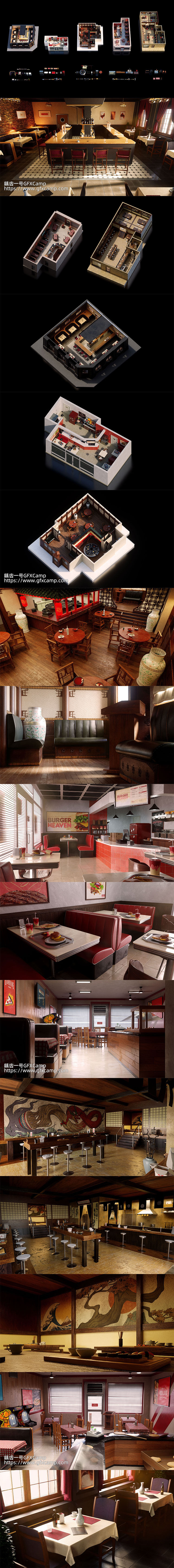 包含中式餐厅、欧式高级餐厅、日本寿司餐厅、快餐店、高级酒吧场景3D模型,是5个直接做好的场景,每个模型都十分精细,包含2K分辨率贴图材质,Blender/FBX/DAE格式