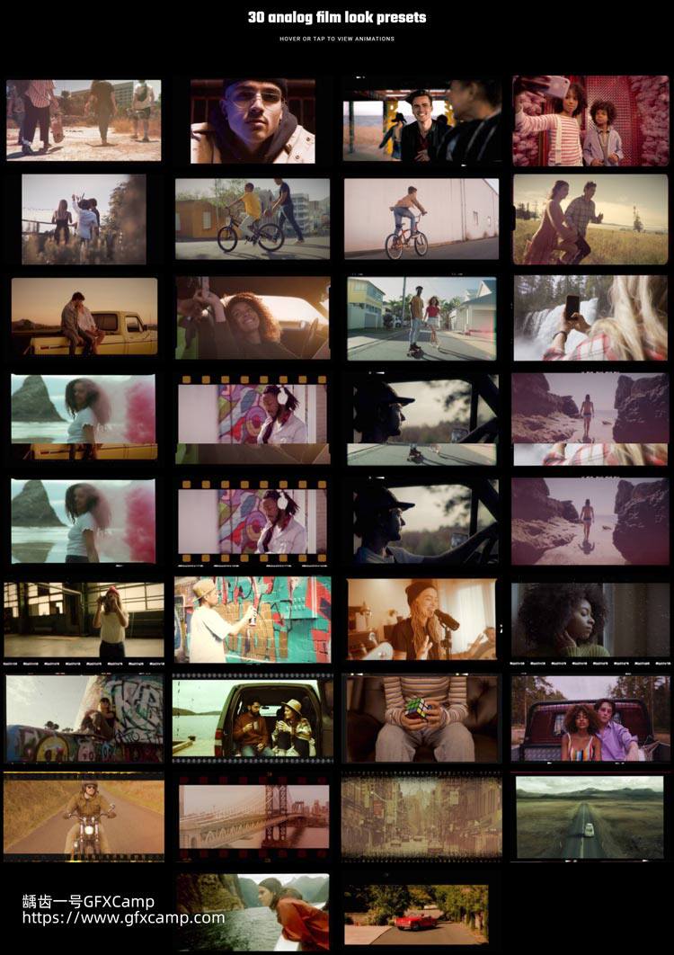 包含30组复古电影胶片质感调色特效预设,可以给视频添加胶片边框,模拟复古调色效果,可以控制噪点划痕、光效、颜色等多种参数,