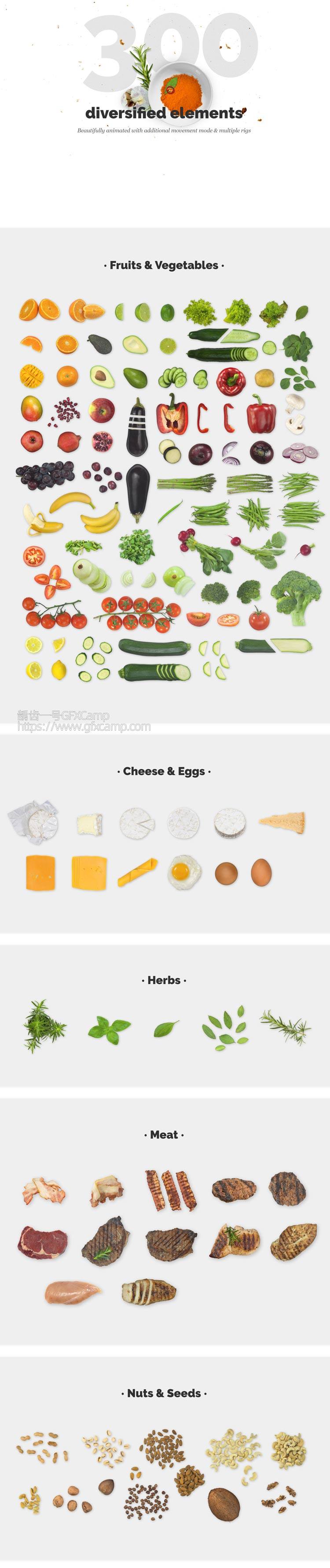 - 包含300组食物动画,比如水果、蔬菜、甜点、肉类、佐料等,都是背景透明的,可以设置是否需要出入动画、大小、位置、旋转等基本参数都可以修改