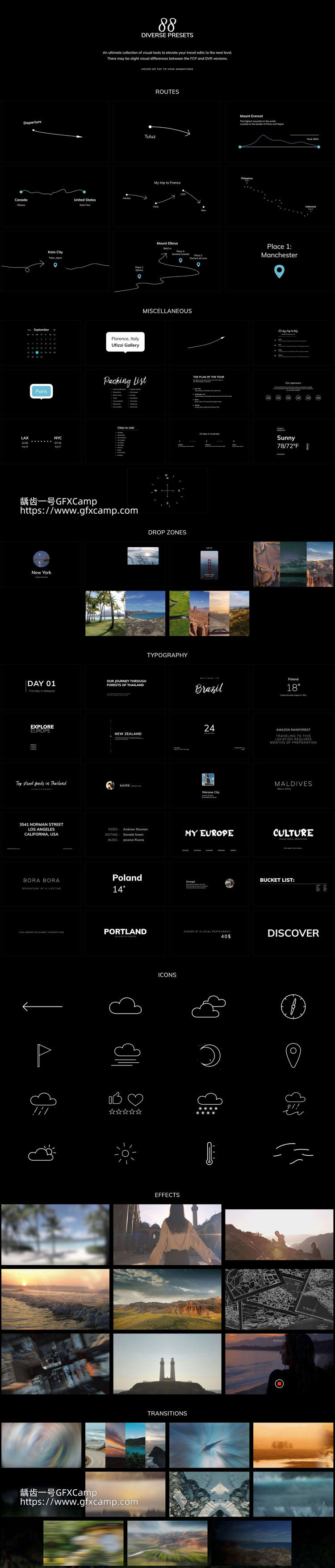 - 包含77组文字标题、图标、路径箭头、占位符动画、视频特效+11组视频转场预设,可以设置是否需要出入动画、文字、字体、颜色、大小、位置、旋转等基本参数都可以修改