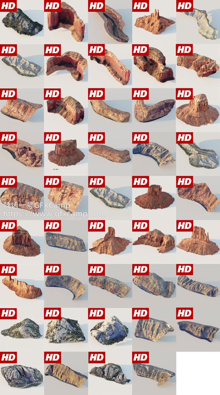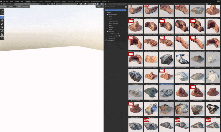 - 包含152组各种风格的高山地形资产预设,44个高精度模型和 108个低精度模型,都是3D 照片扫描,8K贴图,仅用于快速创建逼真的背景,不适用于近距离局部特写。安装后在资产浏览器里可以调用,可视化,直接拖拽即可使用,支持Cycles和EEVEE渲染器