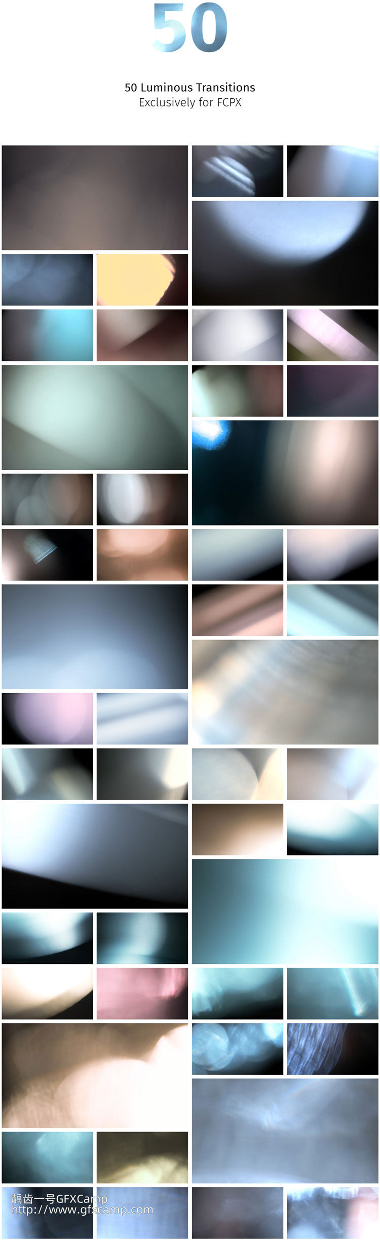 - 包含50组光效叠加视频转场,直接加到两个视频中间即可,光效的强弱、颜色等基本参数都可以修改