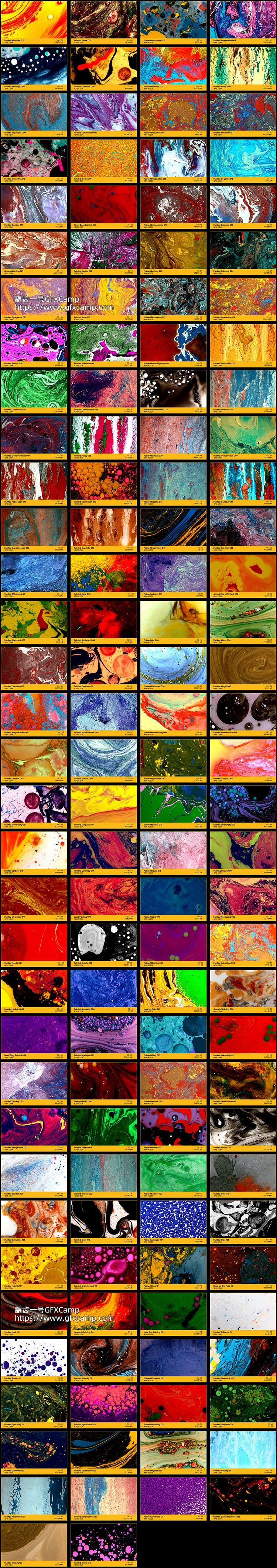 包含134组彩色油漆、油墨慢慢流动的视频素材,4K分辨率,MP4格式,H264编码,不包含透明通道,修改混合方式(屏幕/滤色)即可叠加到自己视频上