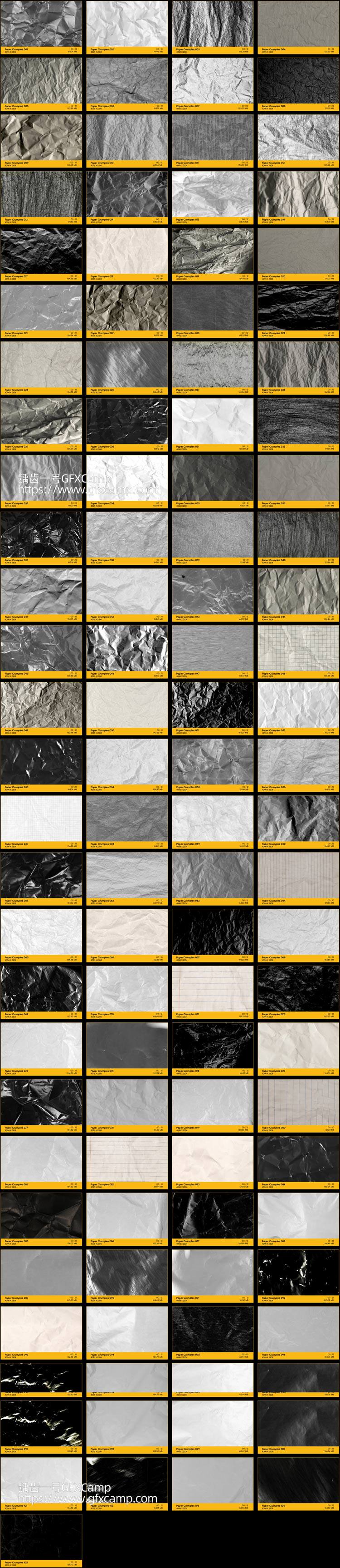 包含105组纸张褶皱定格动画视频素材,4K分辨率,MP4格式,H264编码,不包含透明通道,修改混合方式(屏幕/滤色)即可叠加到自己视频上