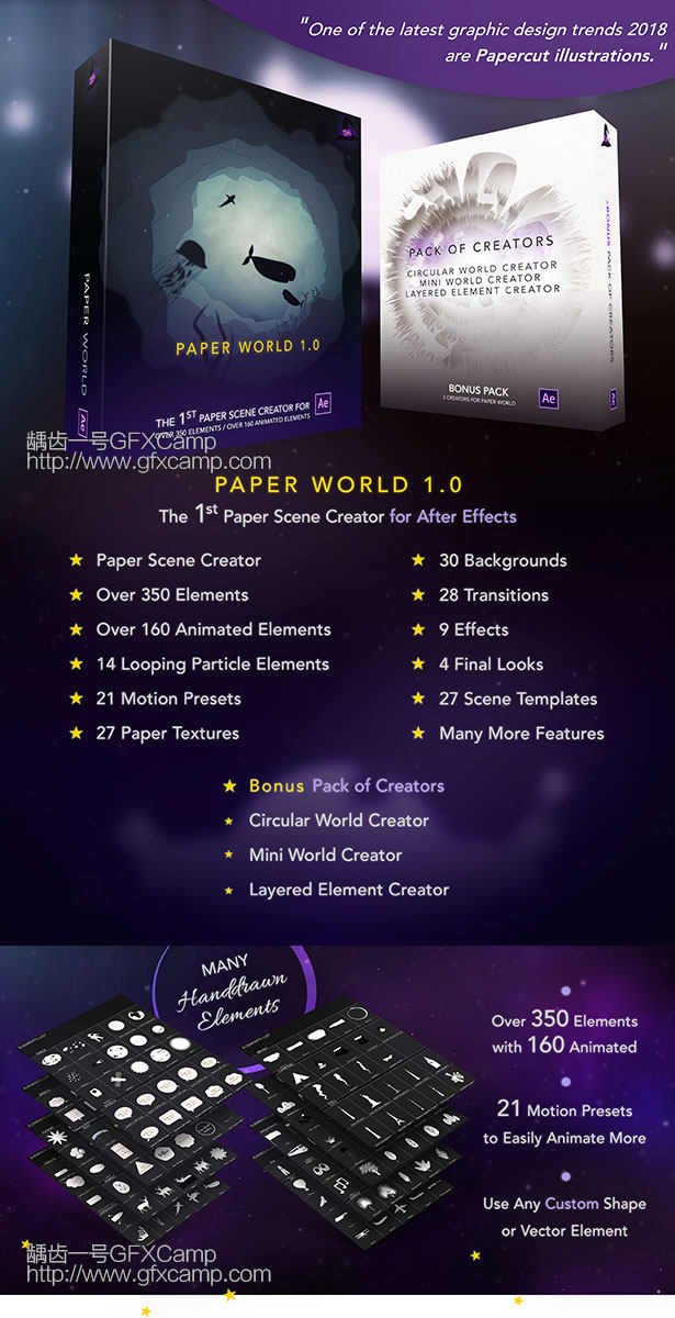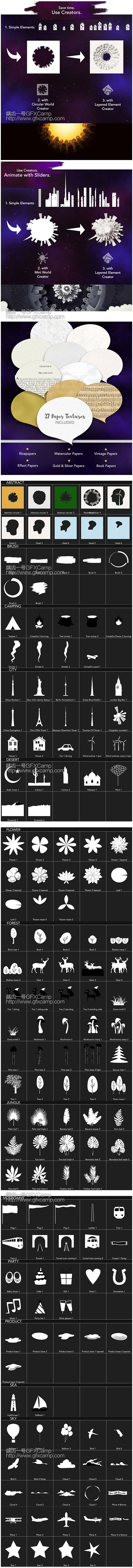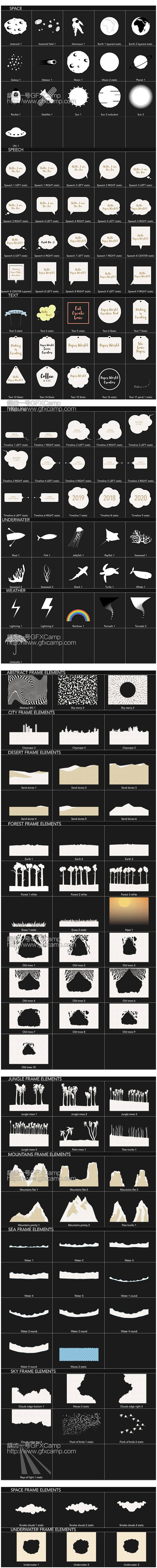 包含27个制作好的场景动画+350个小元素+14个循环粒子背景+41个运动预设+27张纸张材质+30个背景+28个转场+9个特效,元素可以自己随意搭配,制作自己的场景动画
