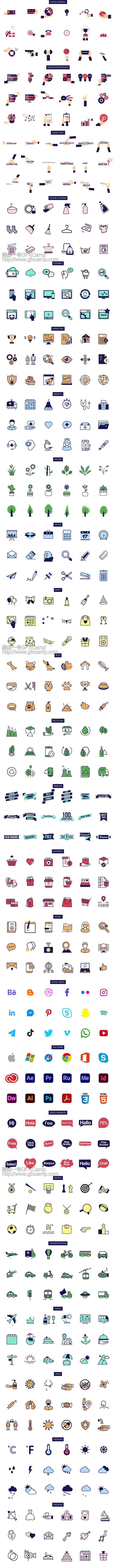 - 包括55个分类共1000组扁平化线条风格图标动画,相对于PR,增加了一些组合好的场景动画等,所有的大小、位置、颜色等都可以修改,动画是可以无限循环的