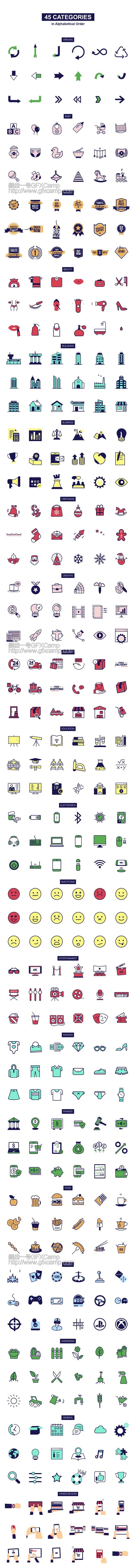 - 包括45个分类共800组扁平化线条风格图标动画,所有的大小、位置、颜色等都可以修改,动画是可以无限循环的