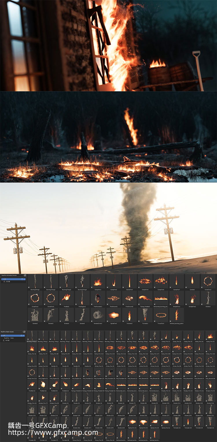 - 包含34组动态VDB+148组静态VDB素材,比如火焰燃烧、龙卷风、烟雾、火环、火球等多种效果,安装后在Blender的资产浏览器里调用,可视化预览,拖拽使用即可