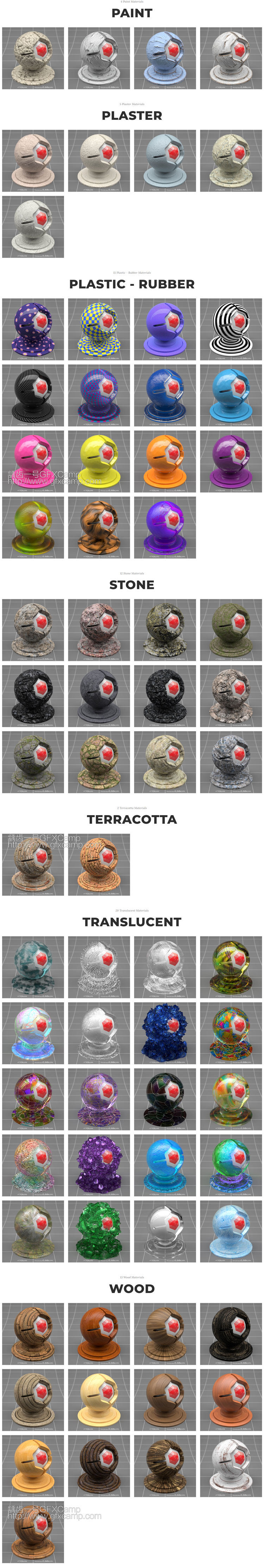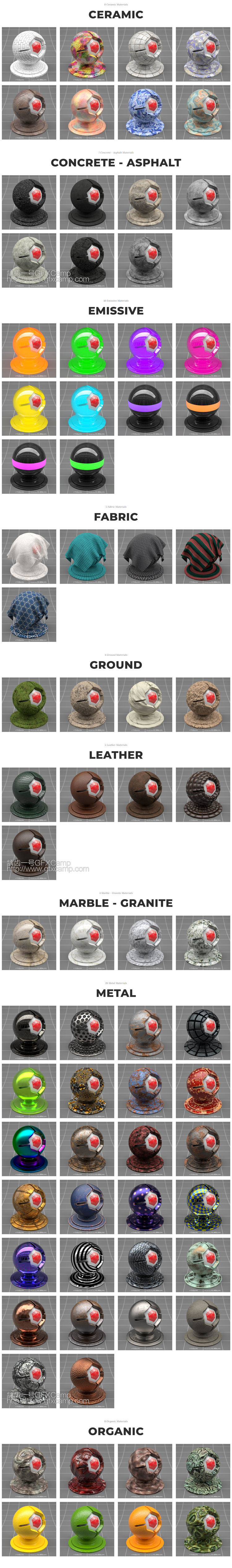 一共包含150个Redshift渲染器用的C4D材质预设,有陶瓷材质、混凝土材质、布料材质、放射性材质、地面材质、皮革材质、钢铁材质、有机材质、大理石材质、塑料材质、橡胶材质、石膏材质、石头材质、透明材质、木纹材质等,绝大部分都是无缝衔接的,污垢划痕等细节程度都是可以调节的