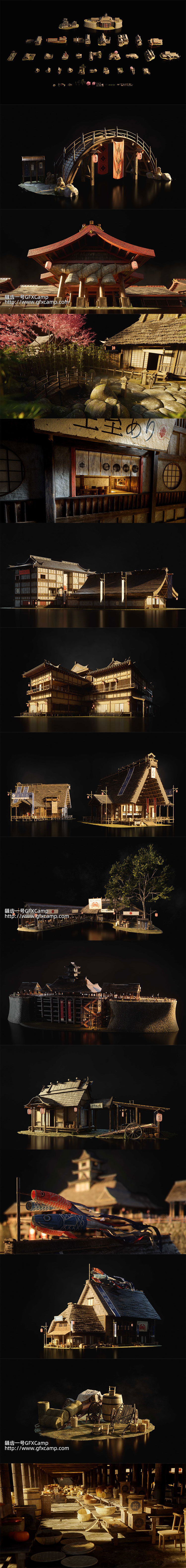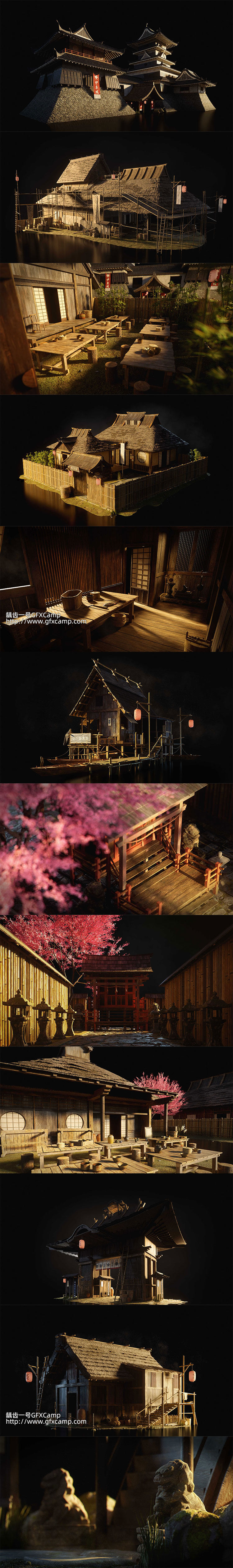 包含日本古代幕府时代风格的木屋房子建筑3D模型,这是单独的模型,不是直接做好的场景,每个模型都十分精细,包含2K和4K两种分辨率贴图材质,C4D/3DS MAX/Blender/FBX/OBJ/UE格式