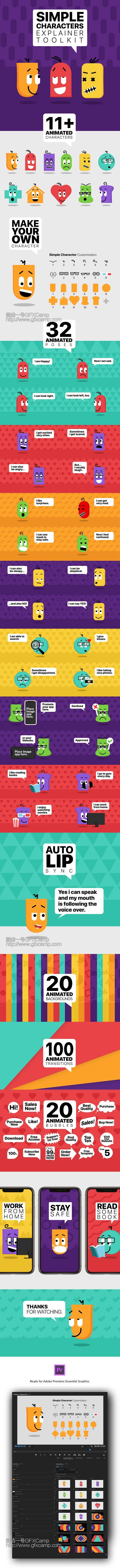 包含11个已经制作好的人物角色,自己也可以修改外貌,26个人物动画+20个背景动画+20个对话框气泡+100个图形转场动画,包含AE模板+PR预设两种形式