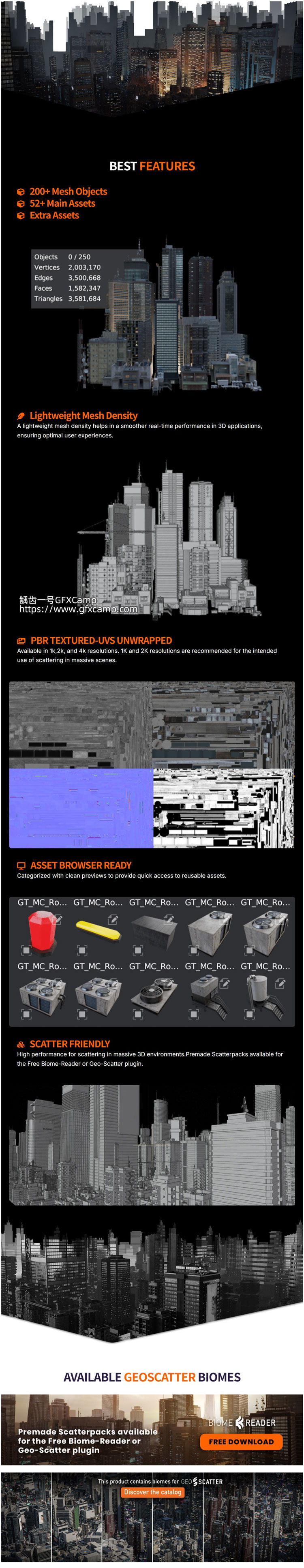 - 包含250+Blender现代城市风格的建筑楼房高楼大厦3D模型资产预设, 安装后在资产浏览器里可以调用,可视化,直接拖拽即可使用,包含1K/2K/4K材质可以选择,也可以通过geoscatter插件快速生成场景