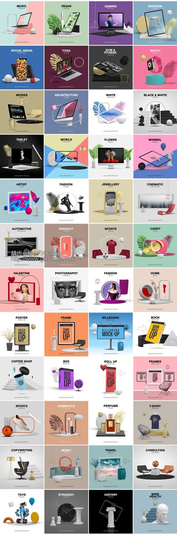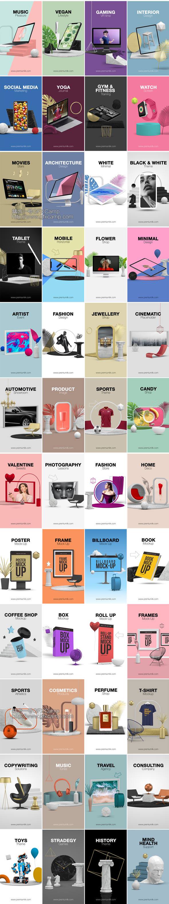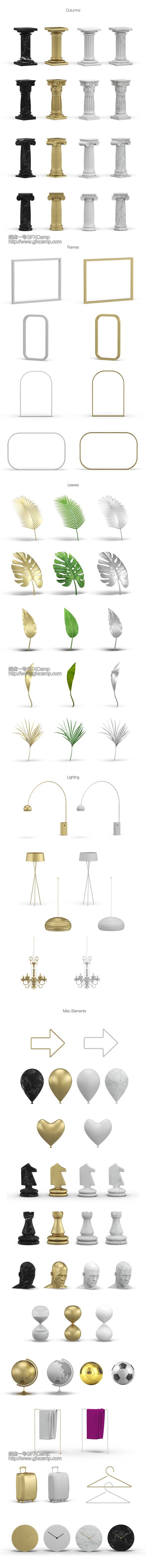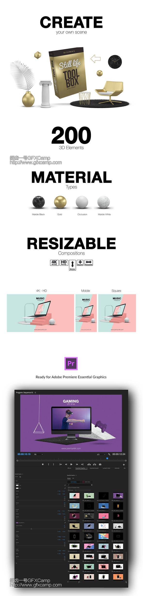 包含200+三维元素动画,每个元素有黑色大理石,金色,环境光,白色大理石三种材质,50组做好的三维场景动画可以直接使用,包含AE模板+PR预设两种形式
