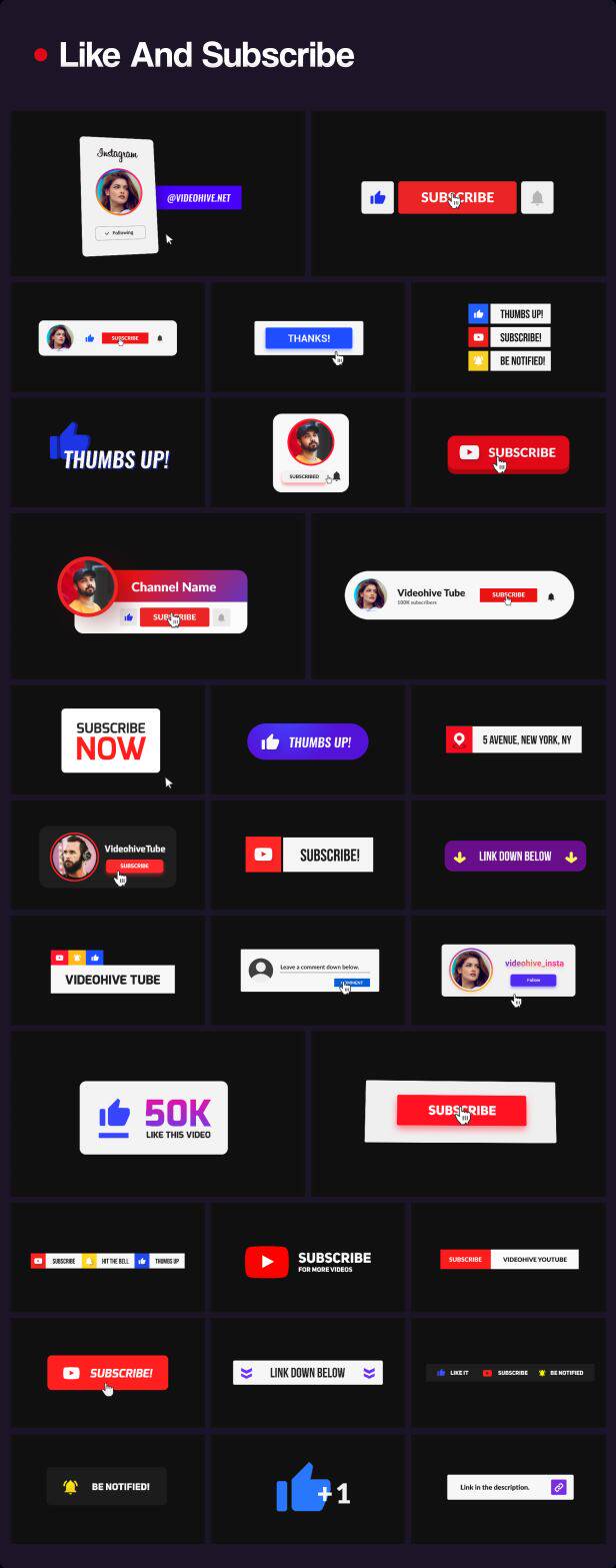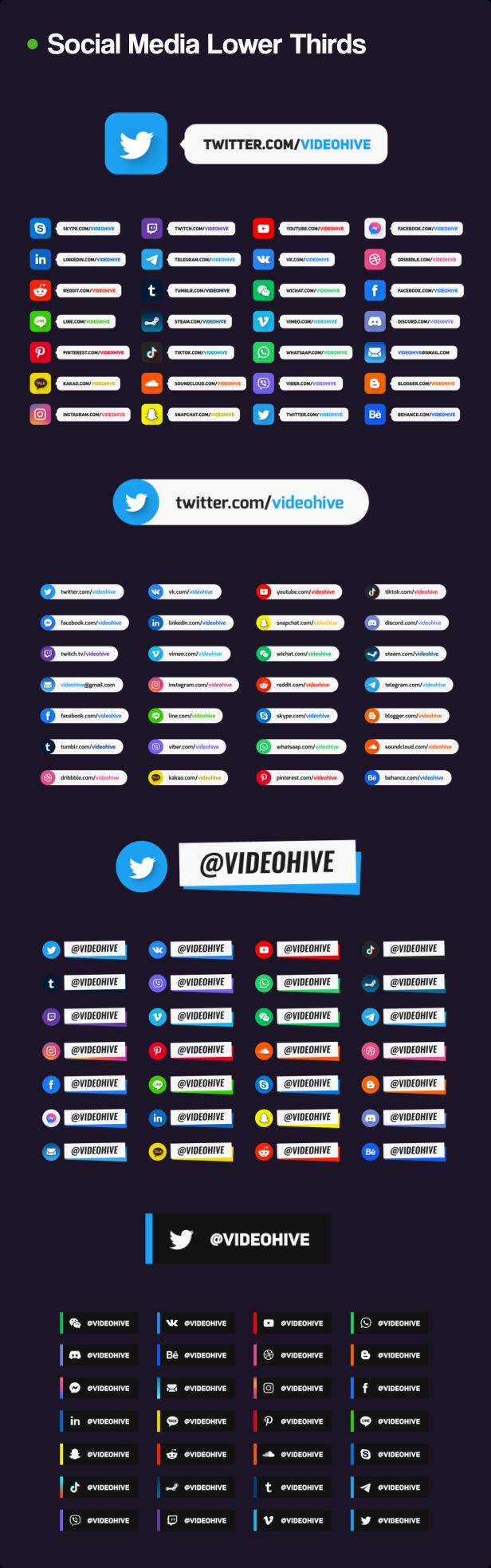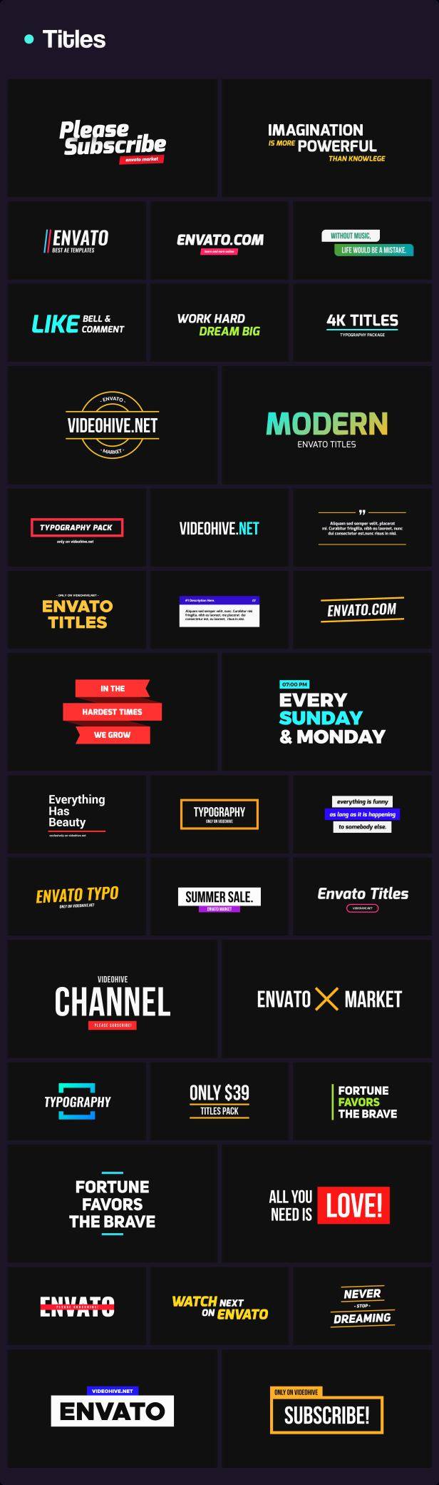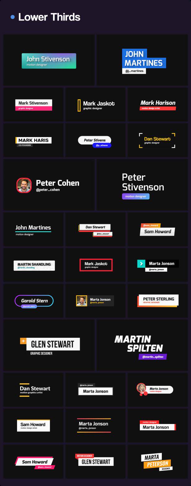 包含文字排版、文字标题、人名字幕条、社交动画、背景动画、图形动画、信息数据、Logo动画、图形转场等多种元素动画,所有元素的文字、颜色等基本参数都可以修改,包含动图预览,包含每个动画单独的工程文件,通过Motion Factory脚本来调用(脚本使用要求2018或者更高版本),使用很方便,文字、颜色等都可以修改